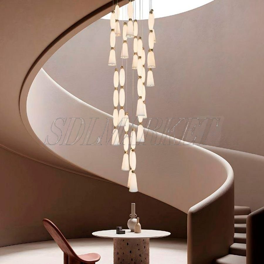 Эта монументальная каскадная люстра диаметром 1200 мм и впечатляющей высотой 5000 мм создана для эксклюзивных интерьеров со вторым светом и просторных лестничных пролетов. Сочетание изящных матовых плафонов и латунных элементов формирует эстетику современного минимализма, а мощный световой поток 855 Вт гарантирует полноценное освещение даже самых масштабных пространств. Высокий индекс цветопередачи CRI 90 и теплая цветовая температура 3000К обеспечивают естественное отображение фактур натурального камня и дерева, создавая атмосферу уютной роскоши.