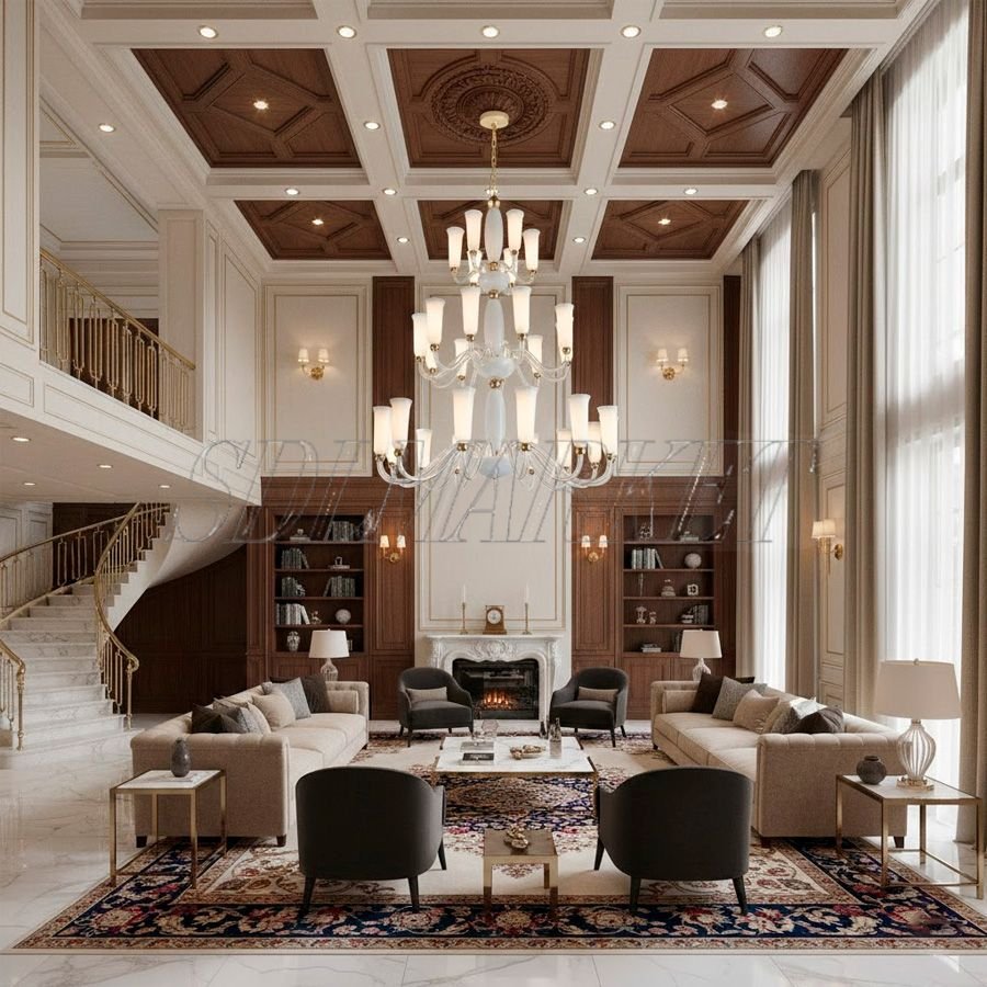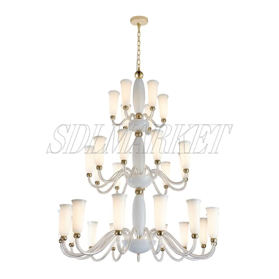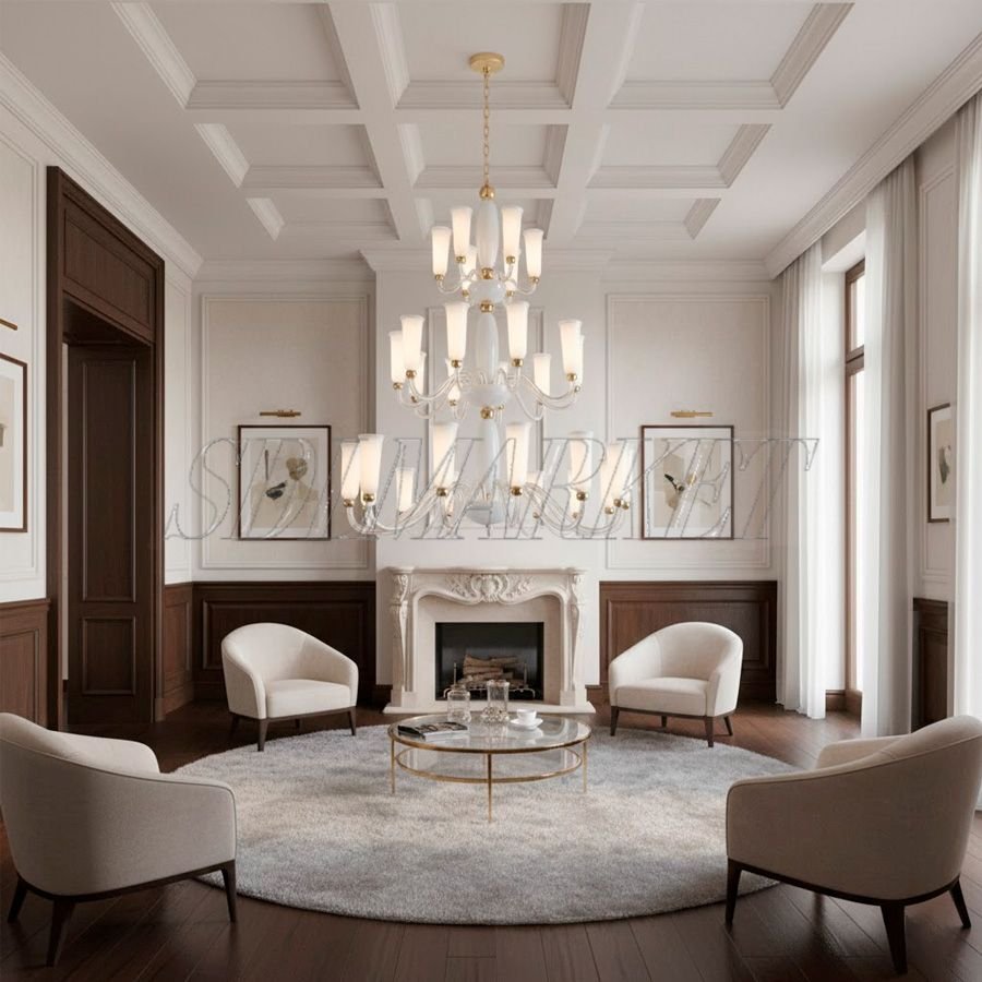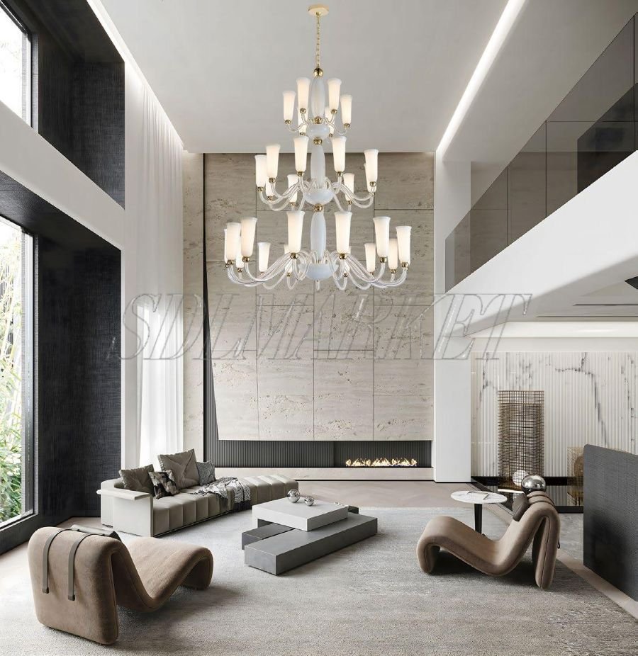 Эта грандиозная трехъярусная люстра в стиле неоклассика создана специально для масштабных пространств с высокими потолками и зон «второго света». Конструкция внушительных размеров (диаметр 1400 мм, высота 1815 мм) выполнена из нержавеющей стали с благородным гальваническим покрытием, что гарантирует долговечность и безупречный блеск. Три уровня изящно изогнутых хрустальных трубок в сочетании с плафонами из белого нефритового стекла формируют величественный каскад света общей мощностью 330 Вт. Мягкая цветовая температура 3000 К и высочайший индекс цветопередачи (≥ 90) создают уютную, но торжественную атмосферу, идеально подчеркивая текстуру натурального мрамора и темного дерева в интерьере.