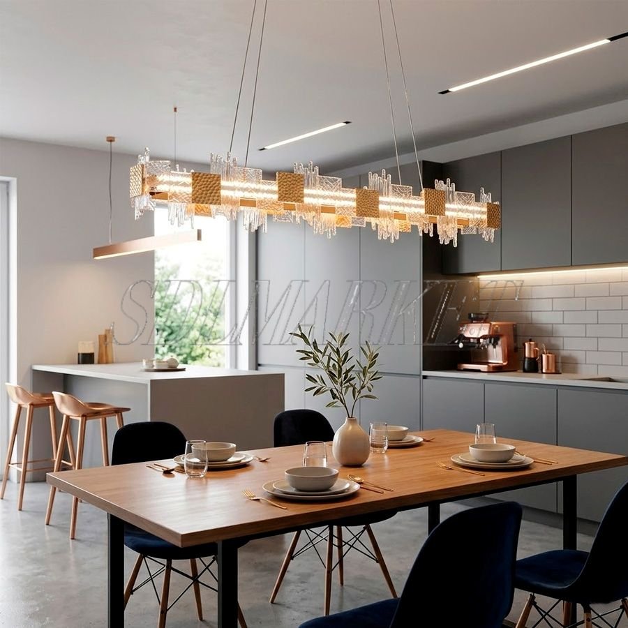 Линейная люстра Galla (арт. MC0100-009) — это изысканный арт-объект, объединяющий современные технологии и художественную эстетику для создания акцентного освещения в интерьере. Модель премиум-класса выполнена из сочетания алюминия и нержавеющей стали с гальваническим покрытием в оттенке «матовое золото» (Champagne Gold), а уникальные элементы из стекла ручной работы обеспечивают мягкое, притягательное свечение. Благодаря высокой мощности 95 Вт и качественным световым характеристикам (цветовая температура 3000К и индекс цветопередачи CRI ≥ 90), люстра размером 1500x300x240 мм гарантирует оптимальный комфорт и естественное восприятие цветов в обеденной зоне, становясь идеальным выбором для ценителей надежности и утонченного стиля.