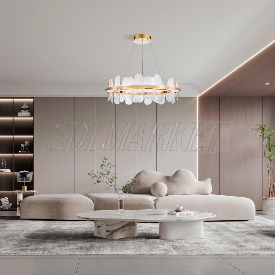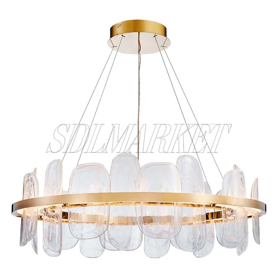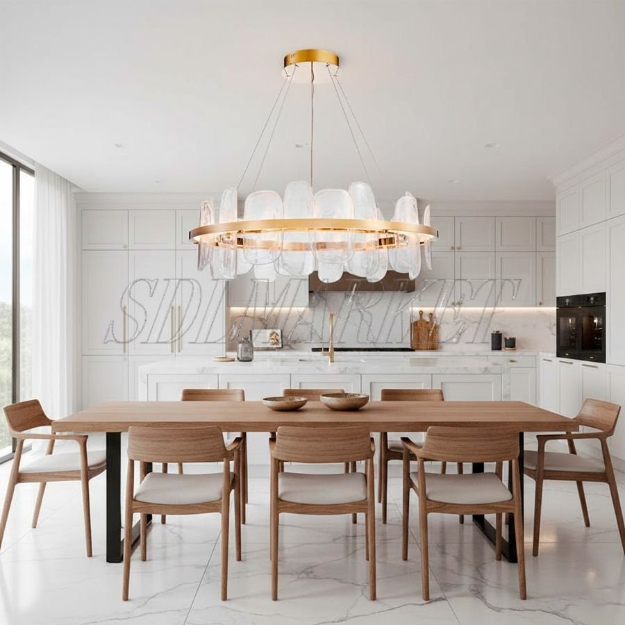 Подвесная люстра MC0190-001 открывает флагманскую серию Ice and Fire (Лед и Пламя). Дизайн построен на эффектном визуальном конфликте: строгое кольцо из нержавеющей стали в цвете «зеркальное золото» символизирует жаркое пламя, а хаотично расположенные лепестки из белого нефритового стекла напоминают тающие льдины. Каждый стеклянный элемент выполнен вручную, что делает светильник уникальным арт-объектом. Благодаря гальваническому покрытию корпуса, золото не тускнеет, а отражения света на металле создают динамичный эффект живого огня, пробивающегося сквозь толщу льда.