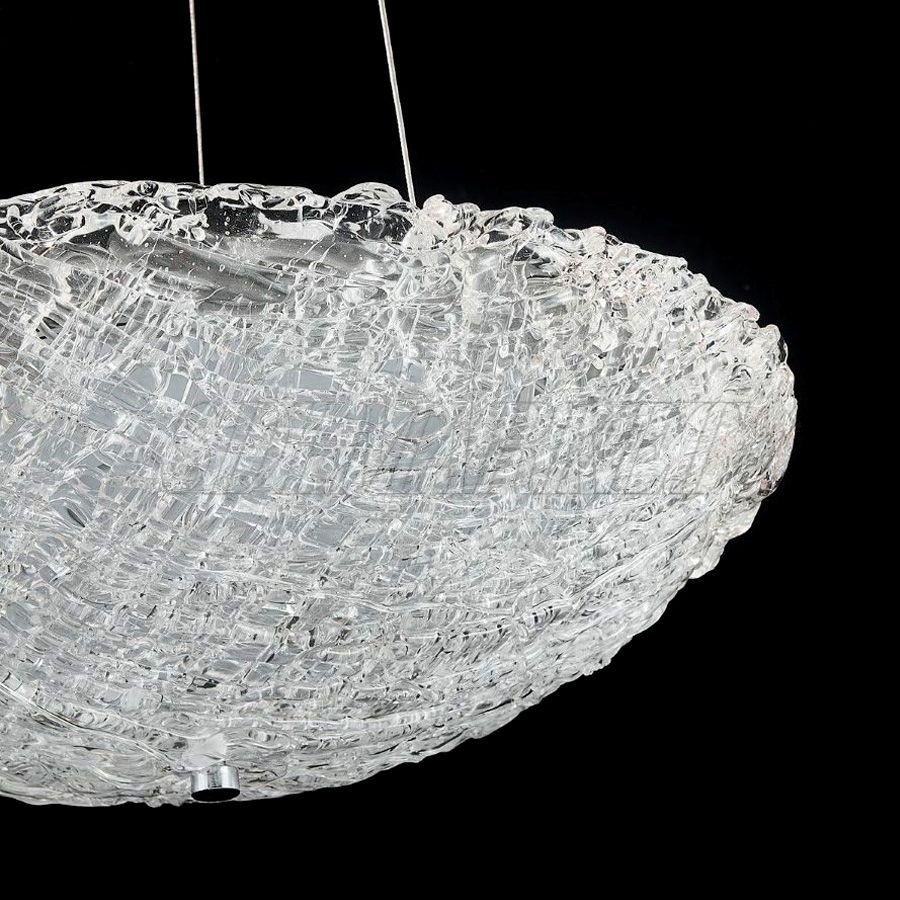 Подвесной светильник Glitter (артикул MC0080-003) представляет собой идеальный баланс между современным ювелирным дизайном и функциональным освещением. Плафон диаметром 500 мм выполнен из уникального фактурного стекла ручной работы, имитирующего игру света на поверхности льда, что в сочетании с основанием из зеркального хрома создает роскошные визуальные эффекты. Модель оснащена энергоэффективным LED-источником с теплой цветовой температурой 3000 К и профессиональным индексом цветопередачи CRI ≥ 90, что гарантирует сохранение естественных оттенков интерьера и создание уютной атмосферы. Этот дизайнерский подвес на тросах станет безупречным акцентом в зоне обеденного стола, гостиной или спальни, гармонично дополняя пространства в стилях ар-деко, неоклассика и минимализм.
