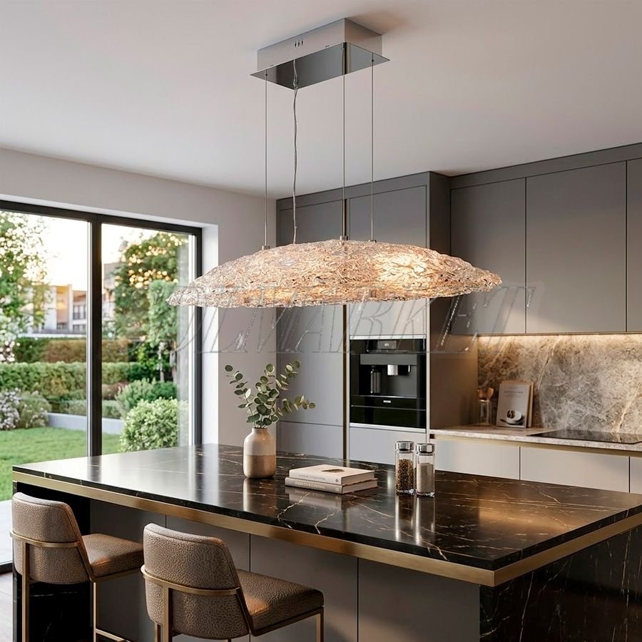 Подвесной светильник из коллекции Glitter (артикул MC0080-008) — это элегантное сочетание современного дизайна и премиальных материалов, созданное для преображения вашего интерьера. Модель длиной 900 мм выполнена из высококачественной нержавеющей стали с эффектным зеркальным хромированным покрытием и дополнена уникальным плафоном из фактурного стекла ручной работы, который создает неповторимую игру бликов. Благодаря теплой цветовой температуре 3000 К и высокому индексу цветопередачи CRI ≥ 90, этот светильник обеспечивает максимально комфортное и естественное освещение, идеально подходящее для зонирования обеденной зоны или гостиной. Гальваническое покрытие корпуса гарантирует долговечность и сохранение безупречного блеска, делая этот дизайнерский подвес центральным элементом стиля лофт, минимализм или неоклассика.