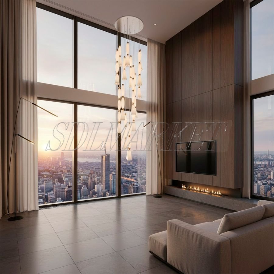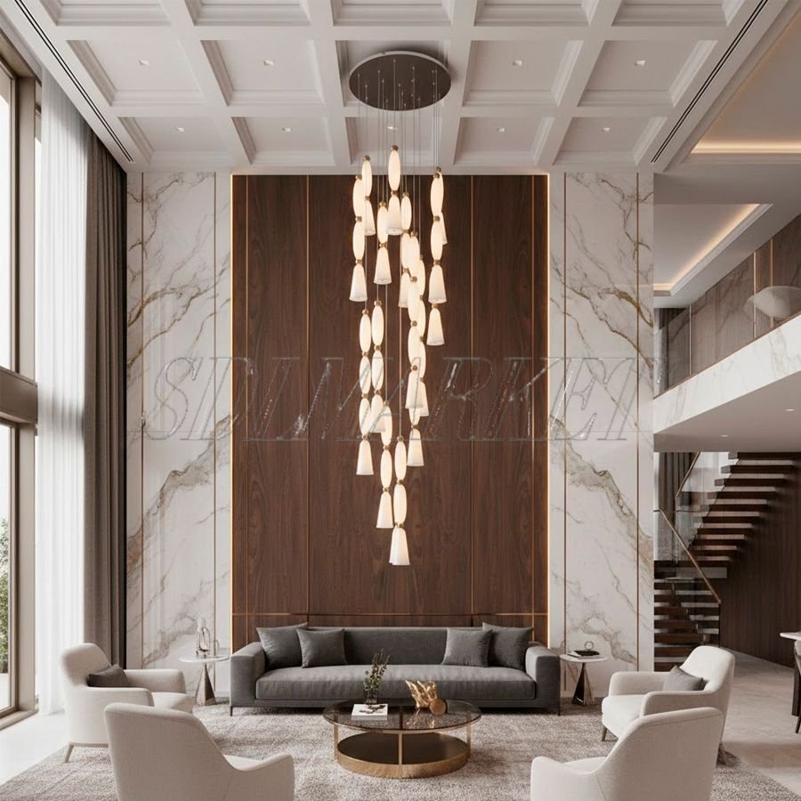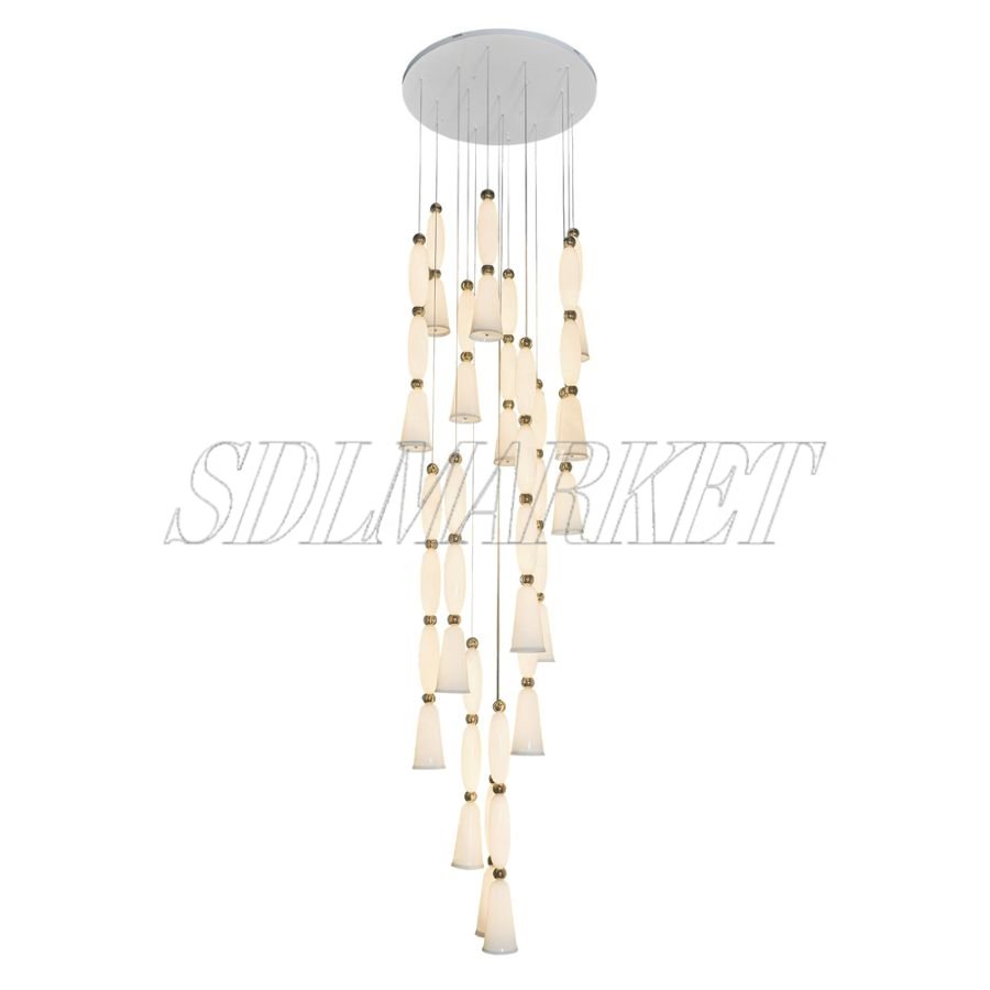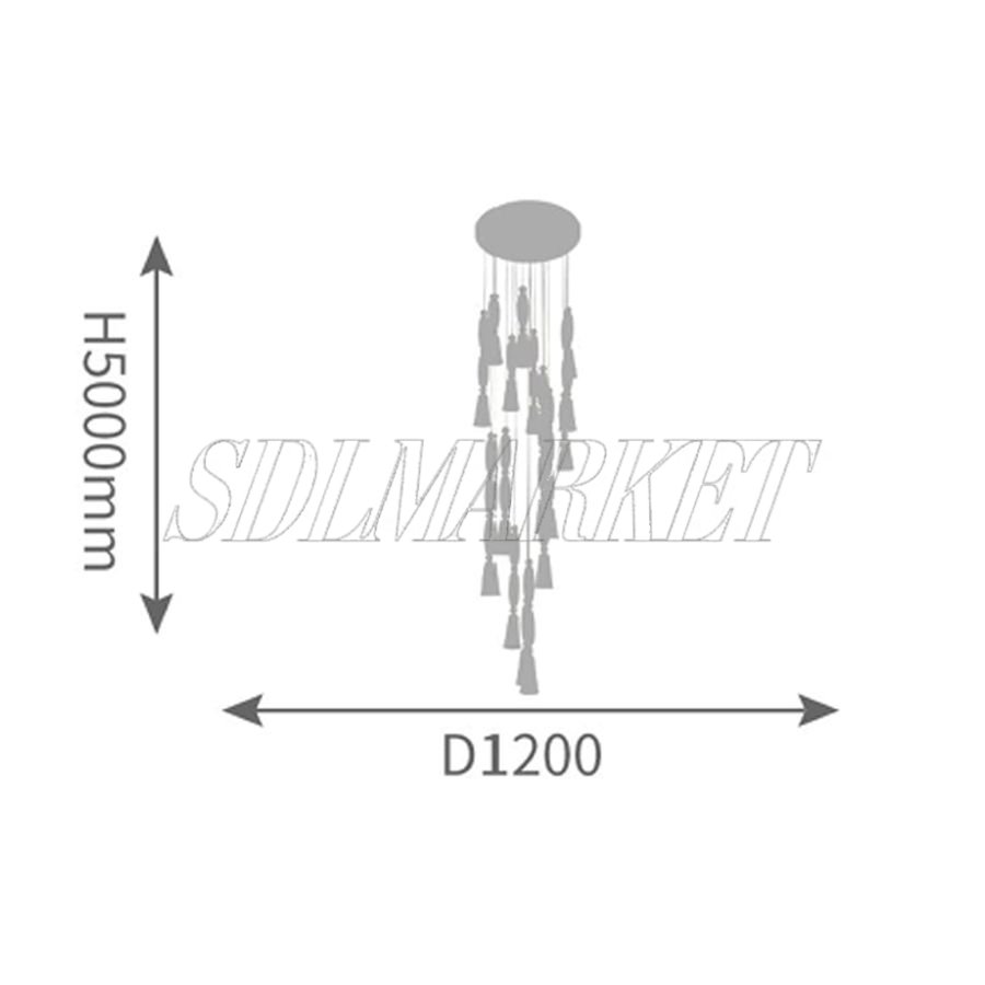 Эта монументальная каскадная люстра диаметром 1200 мм и впечатляющей высотой 5000 мм создана для эксклюзивных интерьеров со вторым светом и просторных лестничных пролетов. Сочетание изящных матовых плафонов и латунных элементов формирует эстетику современного минимализма, а мощный световой поток 855 Вт гарантирует полноценное освещение даже самых масштабных пространств. Высокий индекс цветопередачи CRI 90 и теплая цветовая температура 3000К обеспечивают естественное отображение фактур натурального камня и дерева, создавая атмосферу уютной роскоши.