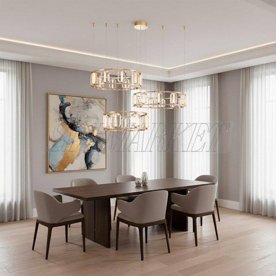 Элегантная подвесная люстра Aura диаметром 600/800/1000 мм — это совершенный баланс современного люкса и эстетики ар-деко, созданный для статусных интерьеров. Модель выполнена из высококачественной фурнитуры с благородным гальваническим покрытием в цвете «золото шампань», которое эффектно дополняют массивные кристаллы K9 с идеальной вертикальной огранкой. Благодаря высокому индексу цветопередачи (Ra ≥ 90) и мягкому теплому свету 3000К, светильник не только создает завораживающую игру бликов, но и обеспечивает максимально естественное и комфортное освещение пространства.