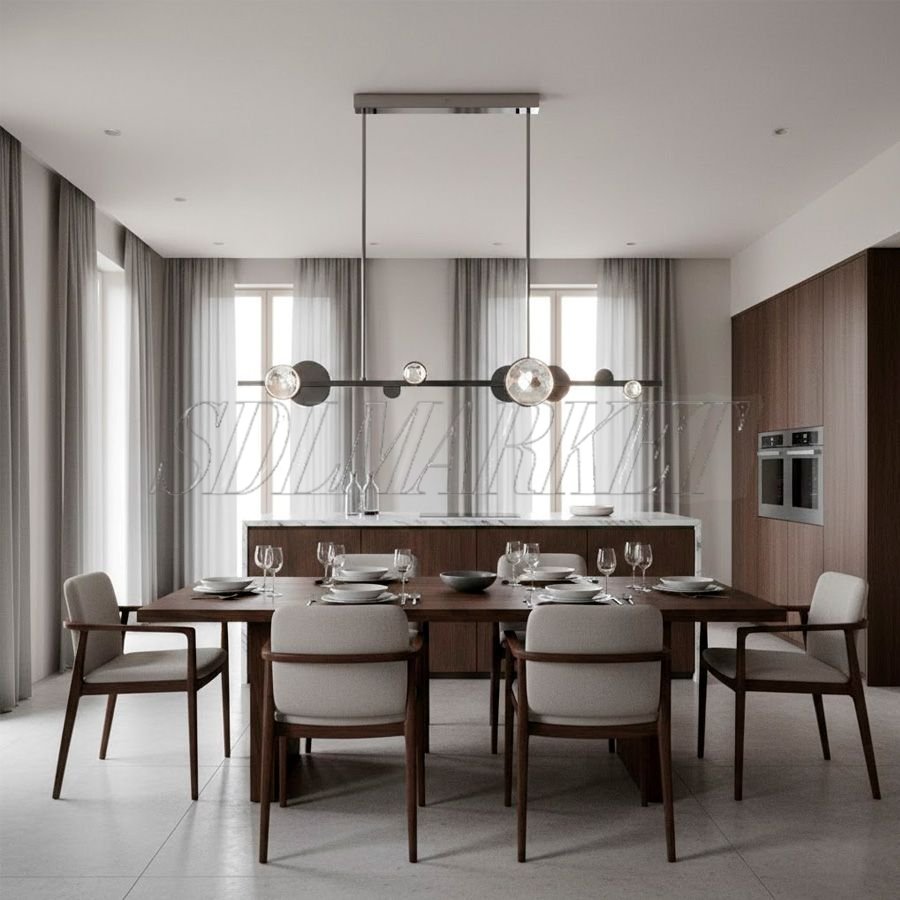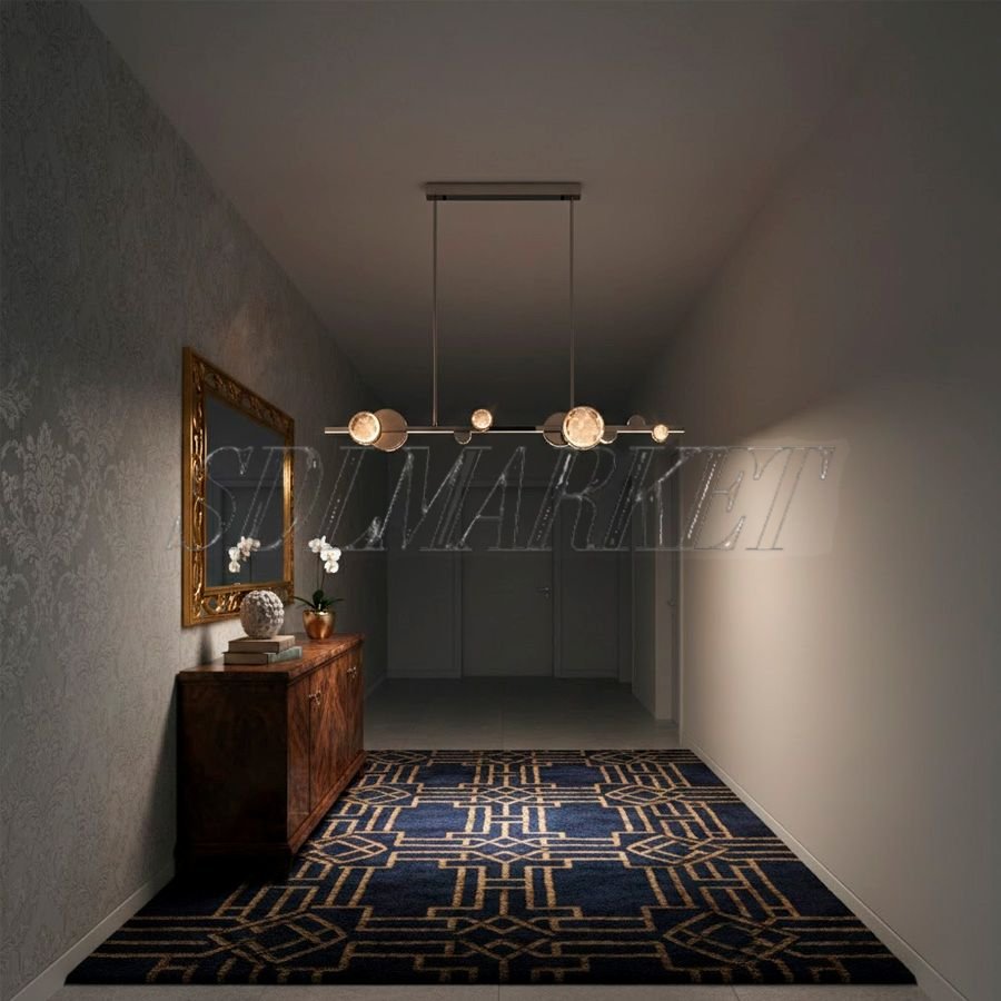 Линейный подвесной светильник из коллекции K9 Diamond — это воплощение изысканной геометрии и роскошного сияния, созданное для преображения современных обеденных зон и кухонных островов. Модель длиной 1200 мм выполнена в эстетике ар-деко: лаконичное основание из высококачественной нержавеющей стали с гальваническим покрытием «зеркальный хром» служит идеальным фоном для россыпи ограненных кристаллов премиум-класса K9. Благородная цветовая температура 3000K в сочетании с высоким индексом цветопередачи CRI ≥ 90 наполняет пространство мягким, естественным светом, превращая светильник в центральный декоративный акцент интерьера.