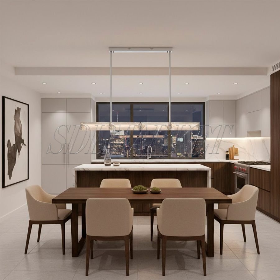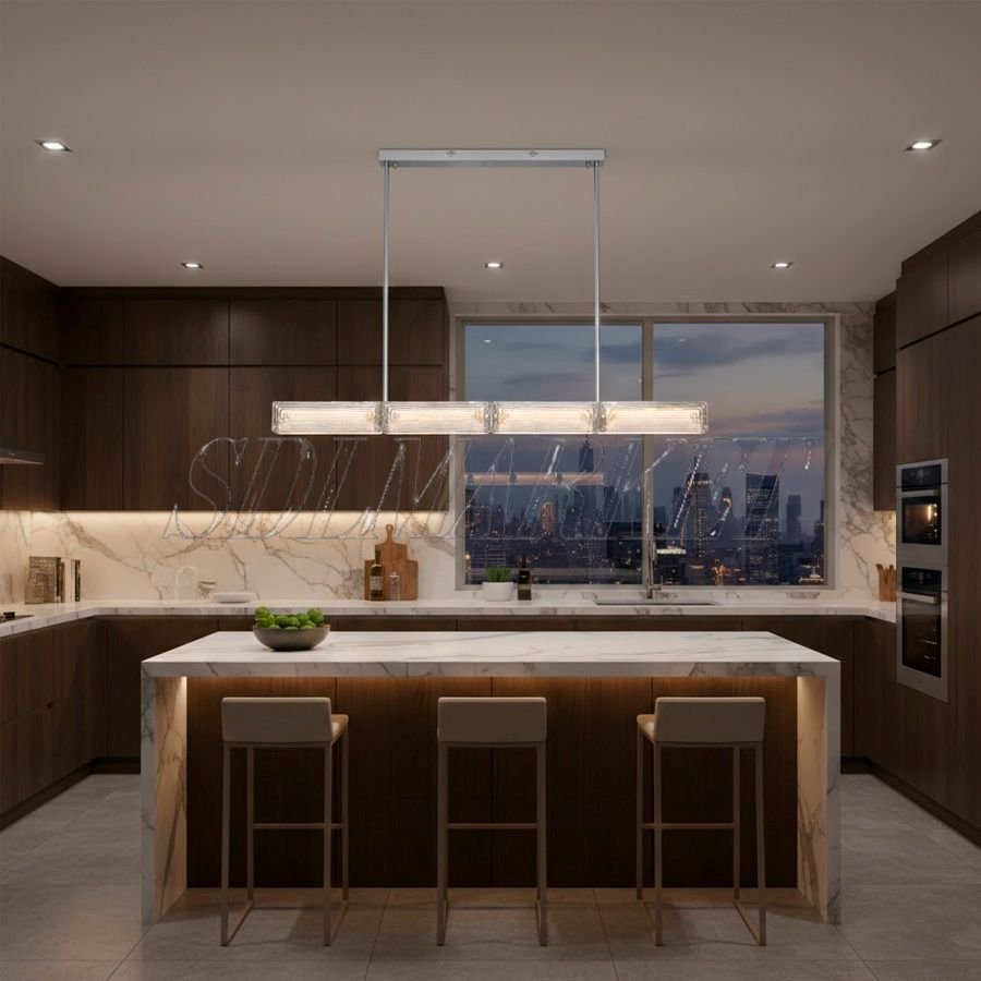 Этот современный линейный светильник в цвете «хром» объединяет в себе строгость нержавеющей стали и изящество художественного стекла ручной работы. Гальваническое покрытие корпуса обеспечивает долговечный блеск и защиту металла, а фактурные стеклянные плафоны мягко рассеивают свет, создавая уютную атмосферу. Благодаря теплой цветовой температуре 3000K и высочайшему индексу цветопередачи CRI ≥ 90, модель идеально подходит для освещения жилых зон, сохраняя естественность всех оттенков интерьера. Компактная ширина и внушительная длина 1080 мм делают его превосходным выбором для акцентной подсветки над кухонным островом, барной стойкой или рабочим столом в кабинете.